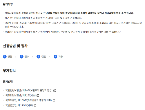 - 국민건강보험 홈페이지 > [개인민원] > [환급금 조회/신청]