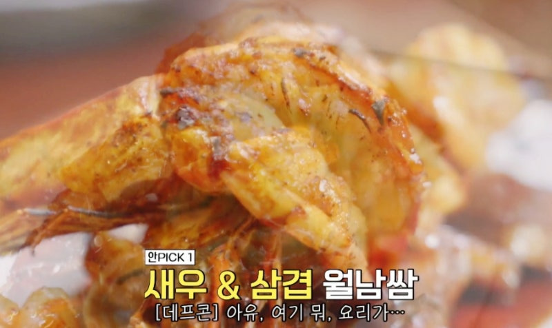 이곳의 대표 메뉴 중 하나로, 탱글한 새우와 촉촉한 삼겹살을 함께 쌈 싸 먹는 재미가 있습니다.
