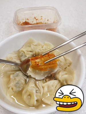 따뜻하고 담백한 국물 + 탱글한 만두 + 김치 한 조각 = 완벽한 한 끼!