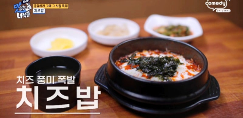 돌솥 위에 치즈가 사르르 녹아내리며 풍미 폭발!