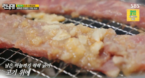 - 고기 위에 다진 마늘이 산처럼 수북하게 올라감