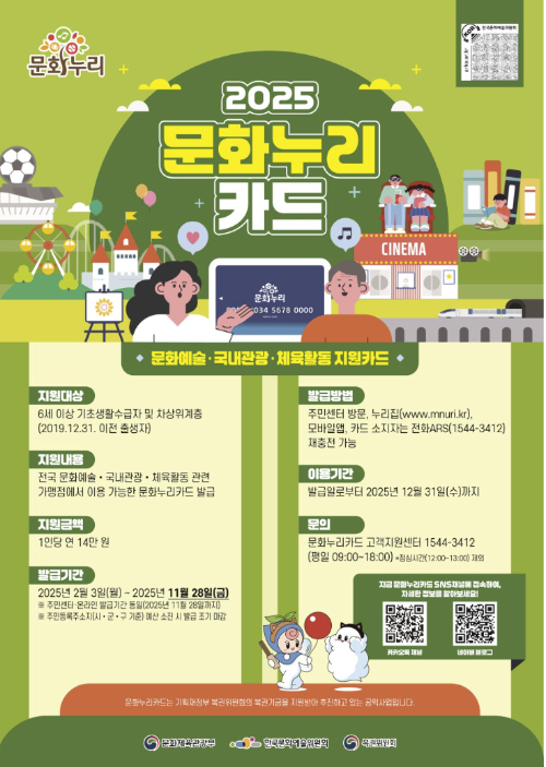 문화누리카드는 기초생활수급자 및 차상위계층을 대상으로 문화·예술·여행·체육 활동을 지원하는 카드입니다.