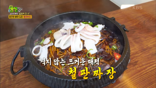 - 뜨거운 철판 위에 짜장면과 오징어 토핑