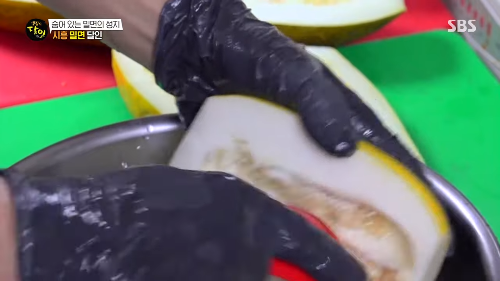 📺 방송에서는 밀면 반죽에 들어가는 노란 육수의 비밀이 공개됐습니다!