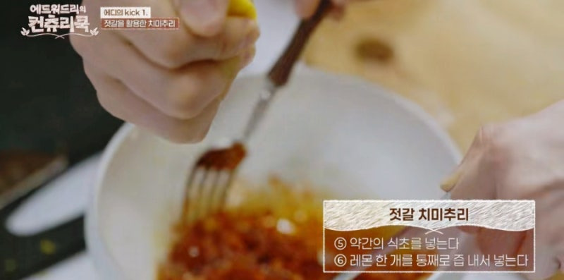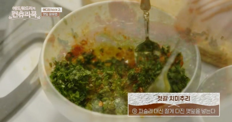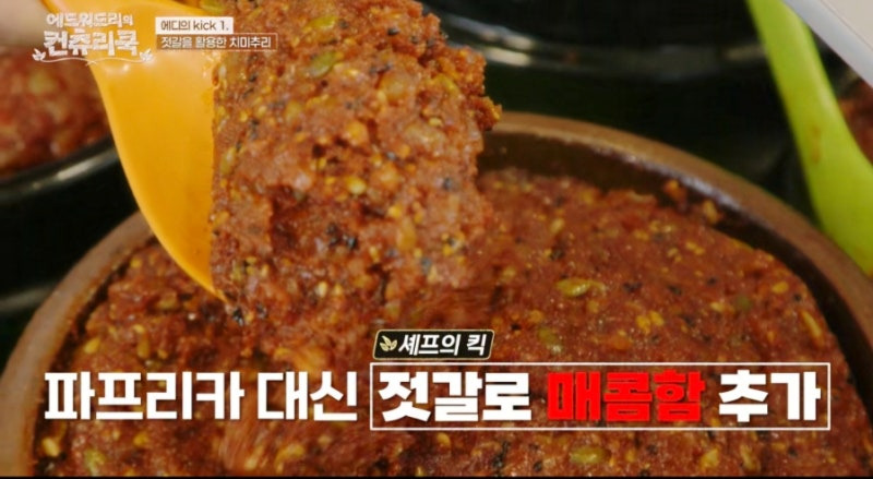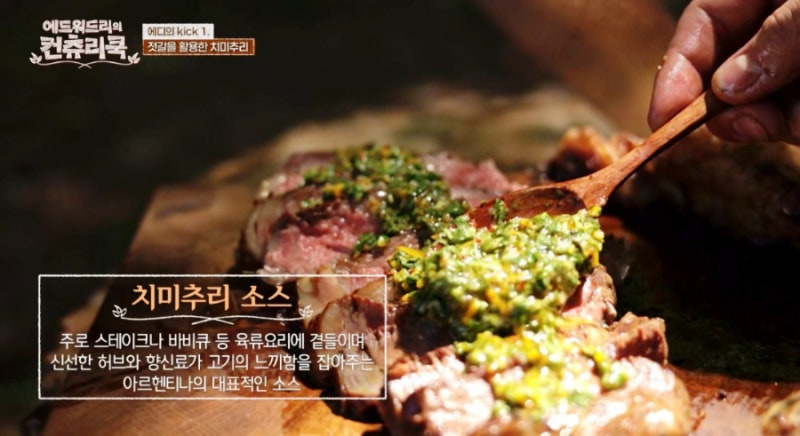 치미추리 소스는 원래 아르헨티나에서 스테이크나 바비큐 등에 곁들이는 것으로 잘 알려져 있습니다. 보통 파슬리, 마늘, 식초, 올리브유 등이 들어가서 상큼하면서도 향긋한 맛을 내는데요. 여기서는 에드워드리 스타일로 ‘젓갈’을 이용해 매콤하고 감칠맛 나는 풍미를 추가해 봅니다.