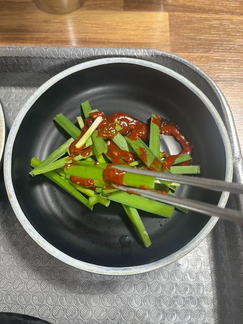 그 후에 부추와 빨간 양념, 그리고 청양고추를 추가해 보세요.