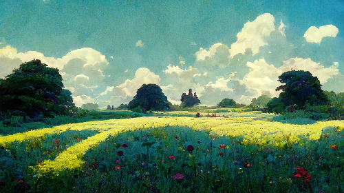 “지브리 애니메이션 스타일로, 초여름의 들판 위에 서 있는 단발머리 소녀. 하늘은 파랗고, 구름이 둥둥 떠 있다.”