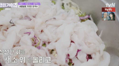 싱싱한 회와 매콤한 비빔국수의 조합! 식감은 쫄깃, 맛은 감칠맛 폭발!